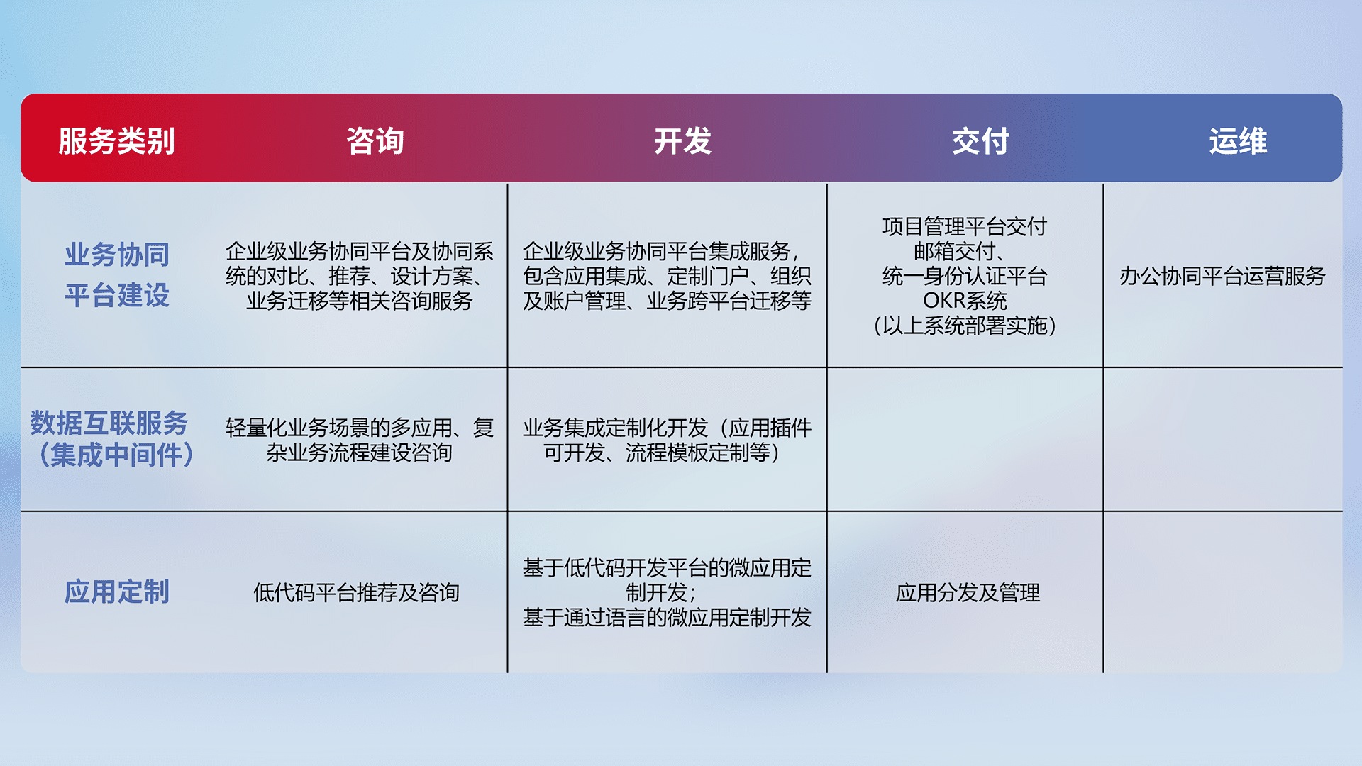 针对钉钉、、、企微、、、、IDaas等平台级产品提供产品的规划、、方案、、、、交付、、、、定制化开发等服务,,,,实现如统一协同办公、、、智能客户服务、、混合会议管理、、、、智能数据查询、、等业务场景,,,,实现数字化转型。。。