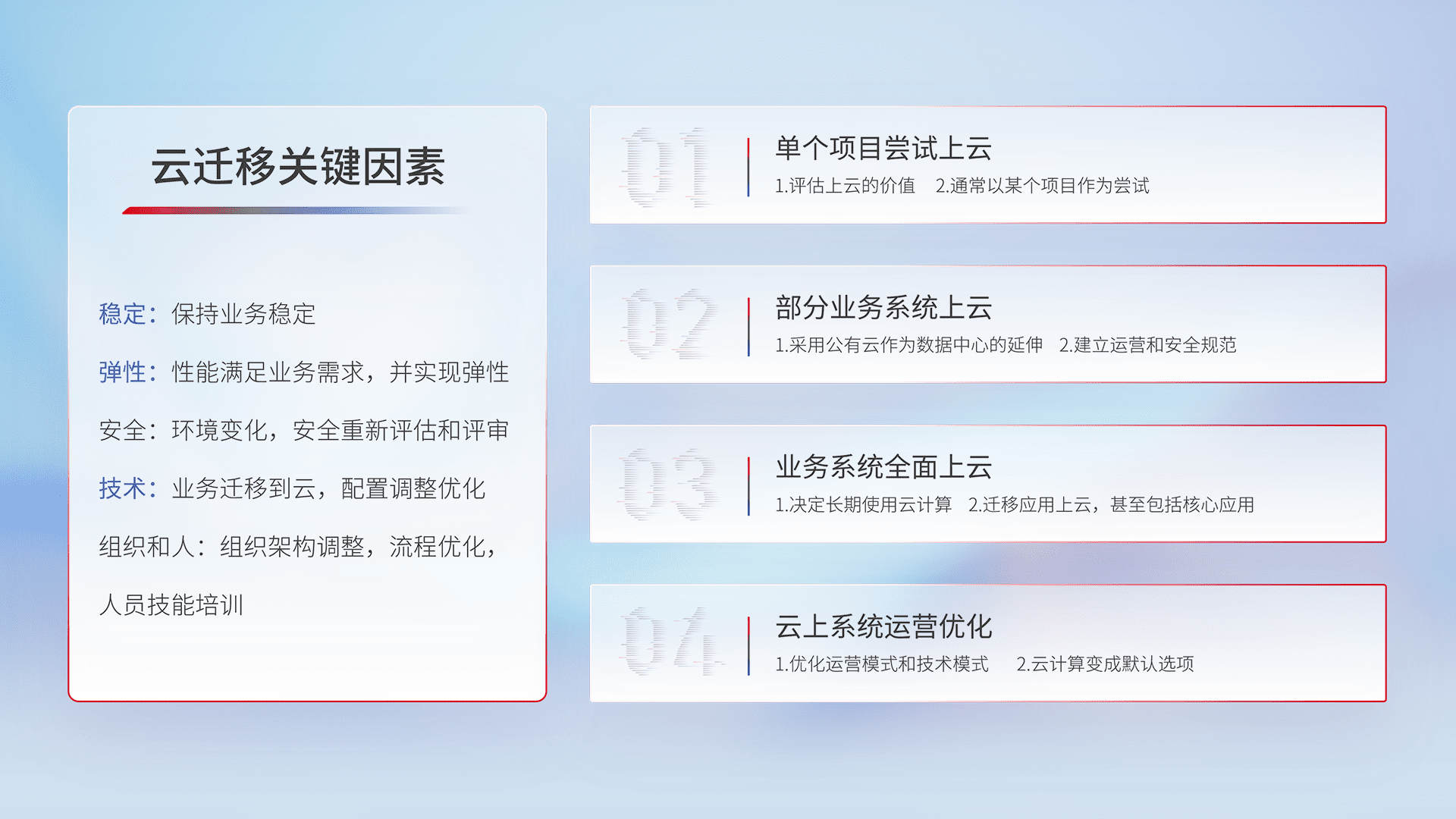 结合实际业务,,,,从规划设计、、、云平台选型、、云原生改造、、、、数据迁移、、、集成交付,,,,迁移全过程为客户识别最佳上云路径,,做好风险识别管理,,设计网络架构、、身份权限、、安全审计合规、、、、操作审计、、、、日志审计、、、、监控告警策略、、、、多站点容灾设计等,,,对云上基础设施进行整体规划,,提升IT治理水平,,,,以满足弹性、、高可用、、高性能的需求。。。
