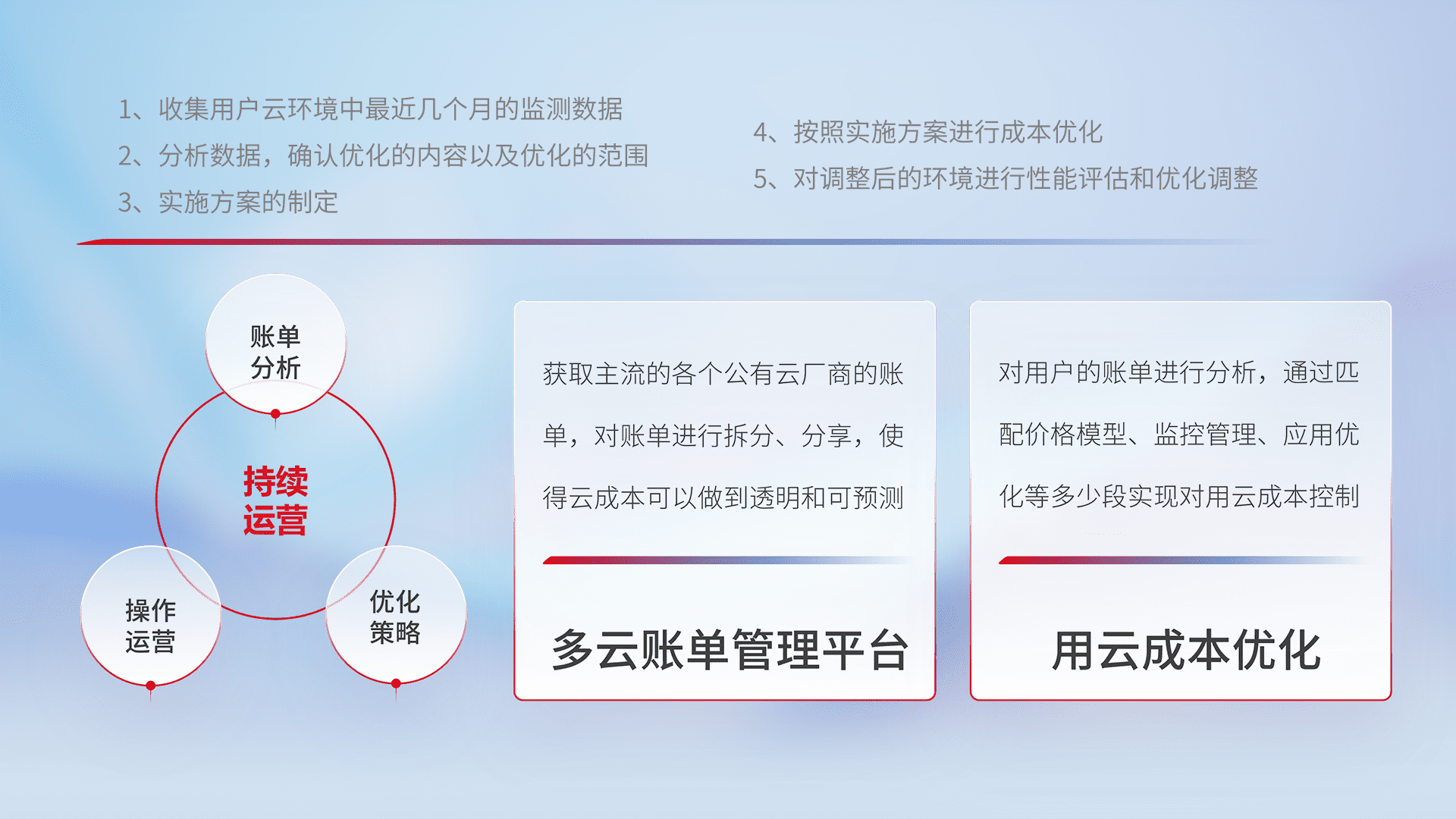 通过多云纳管,,,,以统一的资源数据模型把客户的云资源进行抽象和封装,,,,进而实现对多云资源的统一操作,,,,保障云资源管理的可靠性、、稳定性与可用性。。量身定制化运维内容,,配置、、开发运维、、、、补丁管理、、、、备份、、、监控、、、认证和访问管理、、、审计和日常巡检等,,,保障在用云过程中的可靠度,,,稳定度以及高可用率。。